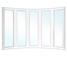 A series of four or more adjoining window units, commonly five in number, installed on a radius from the wall of the building. These types of windows can be installed with head and seat boards.